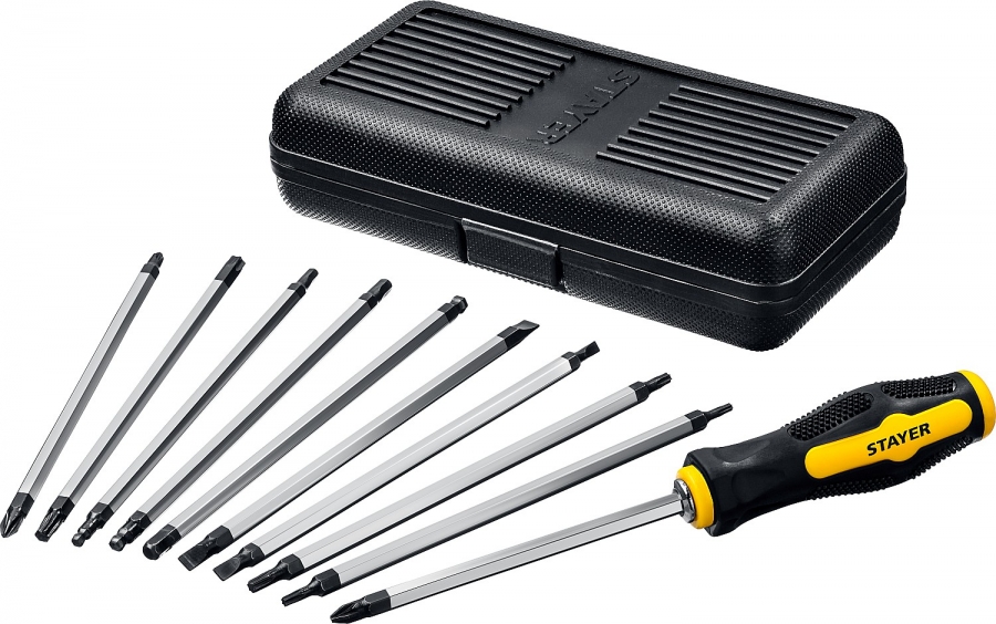 Отвертка с набором переставных хромованадиевых стержней и особой двухпозиционной рукояткой позволяет легко откручивать крепеж различного размера