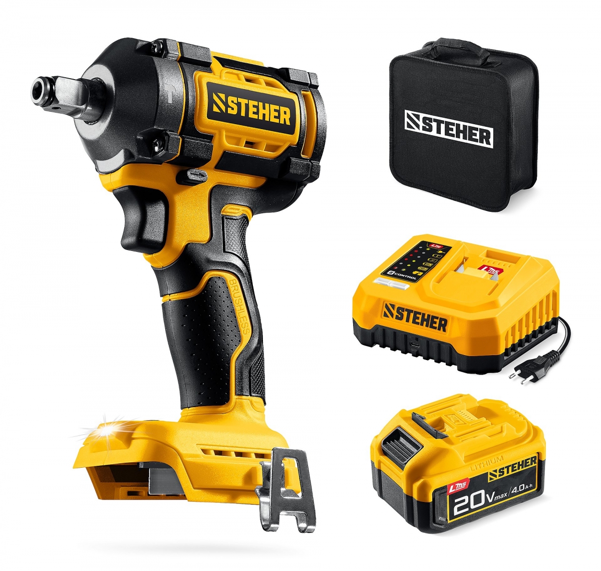 Бесщеточный ударный гайковерт Steher с BRUSHLESS двигателем и максимальным крутящим моментом 350 Н∙м предназначен для фиксации резьбовых соединений размером до М18. Ударная функция с эффективным направлением удара обеспечивает легкое заворачивание без лишней нагрузки на кисть оператора. Имеет современную аккумуляторную систему LMS с 1 АКБ в комлекте, совместимую с одним известным брендом.
