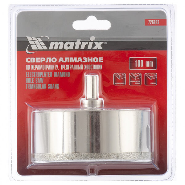 Сверло алмазное по керамограниту 100 х 67 мм, 3-гранный хвостовик Matrix 726883 предназначено для сверления керамогранита, стекла и керамической плитки, обеспечивает точное и чистое отверстие без сколов.
