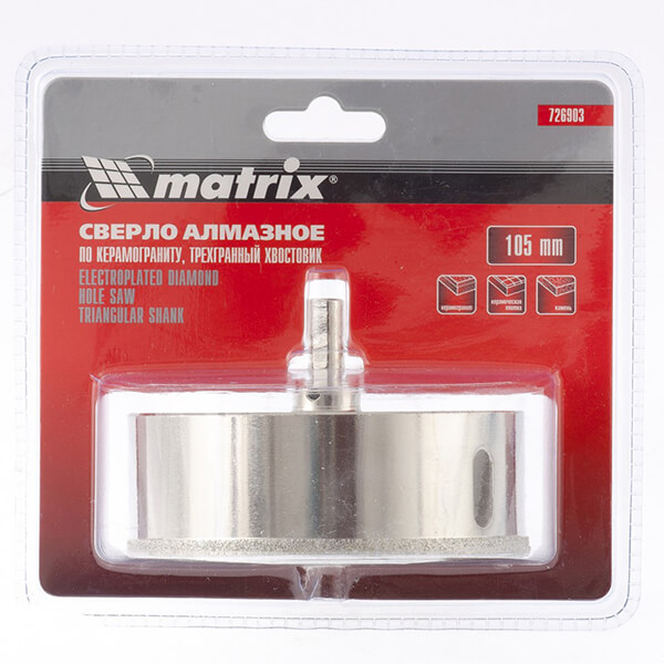 Сверло алмазное по керамограниту 105 х 67 мм, 3-гранный хвостовик Matrix 726903 предназначено для сверления керамогранита, стекла и керамической плитки, обеспечивает точное и чистое отверстие без сколов.