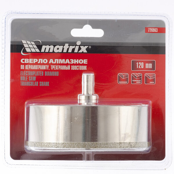 Сверло алмазное по керамограниту 120 х 67 мм, 3-гранный хвостовик Matrix 726963 предназначено для сверления керамогранита, стекла и керамической плитки, обеспечивает точное и чистое отверстие без сколов.