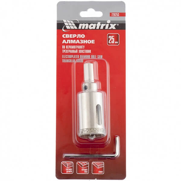 Сверло алмазное по керамограниту 28 х 67 мм, 3-гранный хвостовик Matrix 726283 предназначено для сверления керамогранита, стекла и керамической плитки, обеспечивает точное и чистое отверстие без сколов.