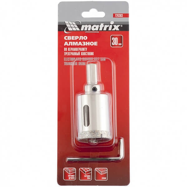 Сверло алмазное по керамограниту 30 х 67 мм, 3-гранный хвостовик Matrix 726303 предназначено для сверления керамогранита, стекла и керамической плитки, обеспечивает точное и чистое отверстие без сколов.