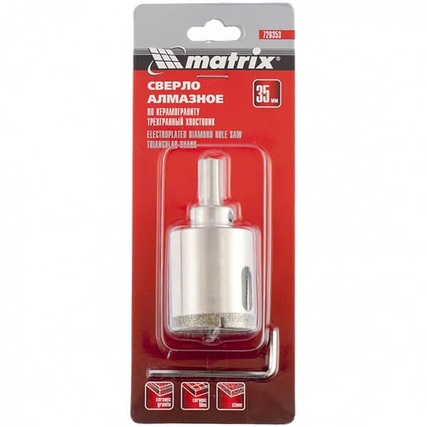 Сверло алмазное по керамограниту 35 х 67 мм, 3-гранный хвостовик Matrix 726353 предназначено для сверления керамогранита, стекла и керамической плитки, обеспечивает точное и чистое отверстие без сколов.