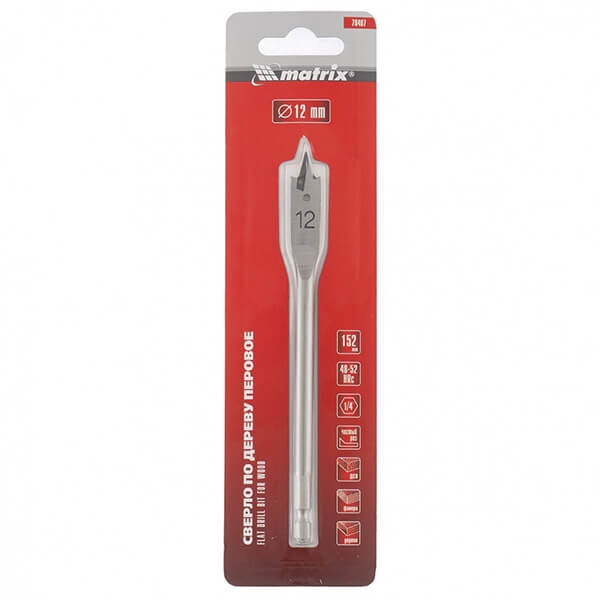 Сверло по дереву перовое 12х152 мм, HEX Matrix 70407 предназначено для получения отверстий в мягкой и твердой древесине с любым расположением волокон, клееной фанере, ДСП. Линейка имеет выгодную цену, презентабельную упаковку и полный размерный ряд от 6 до 55 мм. Сверло перовое изготовлено из углеродистой стали. Твердость режущих кромок 45–54 HRС. Может использоваться с ручной механической и электрической дрелями и шуруповертами. Имеет плечевое заострение. Хвостовик шестигранной формы предотвращает проворот сверла в патроне. Сверла от 6 до 40 мм могут использоваться с удлинителем 70495.