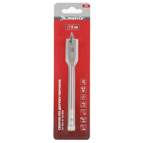 Сверло по дереву перовое 14х152 мм, HEX Matrix 70409 предназначено для получения отверстий в мягкой и твердой древесине с любым расположением волокон, клееной фанере, ДСП. Линейка имеет выгодную цену, презентабельную упаковку и полный размерный ряд от 6 до 55 мм. Сверло перовое изготовлено из углеродистой стали. Твердость режущих кромок 45–54 HRС. Может использоваться с ручной механической и электрической дрелями и шуруповертами. Имеет плечевое заострение. Хвостовик шестигранной формы предотвращает проворот сверла в патроне. Сверла от 6 до 40 мм могут использоваться с удлинителем 70495.