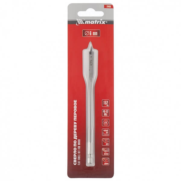 Сверло по дереву перовое 6х152 мм, HEX Matrix 70400 предназначено для получения отверстий в мягкой и твердой древесине с любым расположением волокон, клееной фанере, ДСП.
