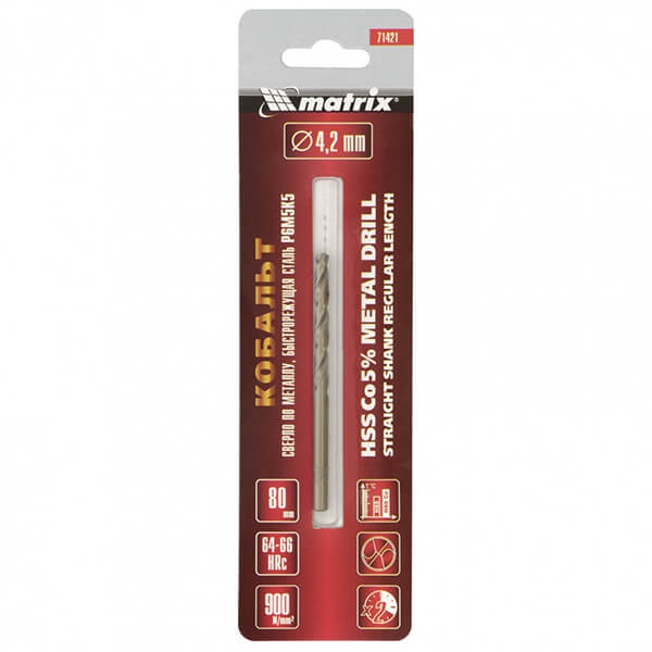 Сверло по металлу 4,2x75x43 мм, HSS Co-5% Matrix 71421 применяется для сверления отверстия в металле. Оно изготовлено методом вышлифовывания профиля, имеют несколько увеличенную сердцевину, что позволяет инструменту выдерживать значительные нагрузки при сверлении трудно обрабатываемых материалов. Поперечная режущая кромка удалена при помощи подточки, облегчающей процесс засверливания, также, благодаря подточке уменьшается потребность в прикладывании значительных физических усилий при работе. Данные сверла изготовлены из кобальтовой стали, придающей инструменту дополнительную твердость и теплостойкость. К данному инструменту предъявляются повышенные требования по точности и качеству изготовления, поэтому сверла подходят для профессионального использования.