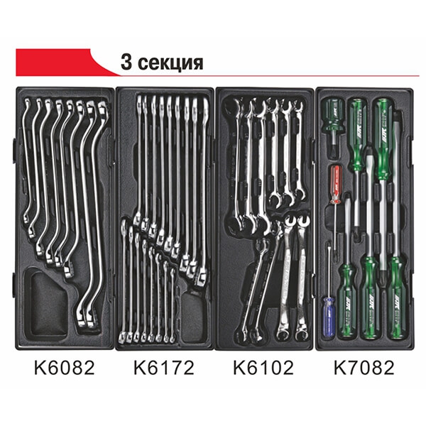 Тележка инструментальная (JTC-3931) 3 секции с набором инструментов 225 шт. JTC JTC-3931+225 широко распространена для организации рабочего места мастера на производственном участке, в ремонтных мастерских, автосервисах. Тележка имеет мобильную конструкцию, без труда перемещается по рабочей площадке. Выдвижные ящики легко открываются и при необходимости полностью извлекаются из корпуса. Три секции из семи заполнены ручными инструментами различного назначения.