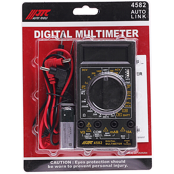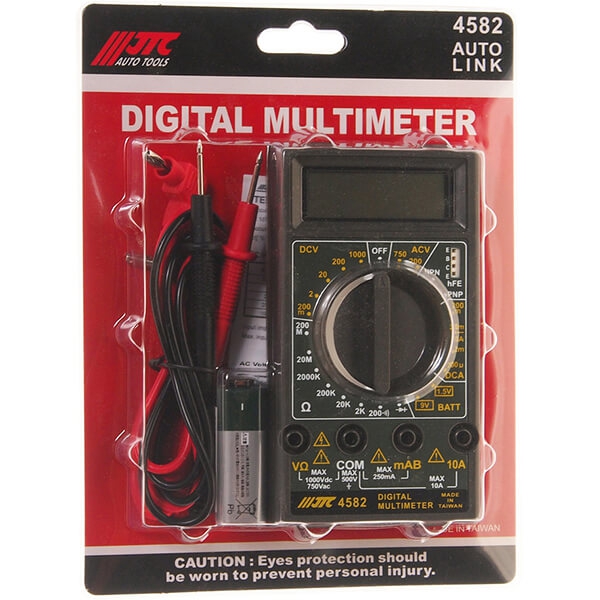 Тестер автомобильный цифровой JTC JTC-4582. Спецификации точности имеют вид: ±( [% от показа] + [Число наименее значимых цифр] ). 18-28 °С с относительной влажностью до 75%. Индикация разряженной батареи. 3-1 / 2-разрядный ЖК-дисплей, макс. считывание 1999.