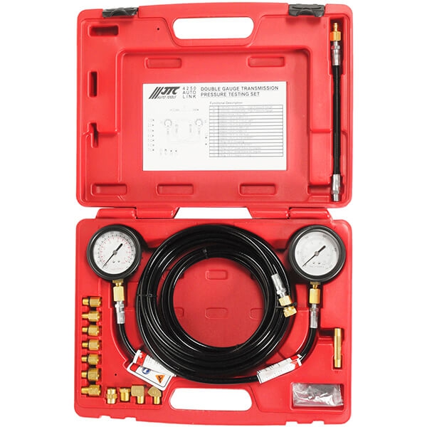 Тестер давления масла КПП с двумя манометрами в кейсе JTC JTC-4250 предназначен для измерения и проверки давления рабочей жидкости (трансмиссионного масла) в автоматических коробках передач в двигателях легковых и грузовых автомобилей.