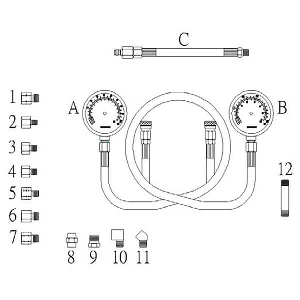 - Манометр для низких значений - 0-100 PSI (0-700 kPa), с гибким удлинителем и быстроразъемным соединением;