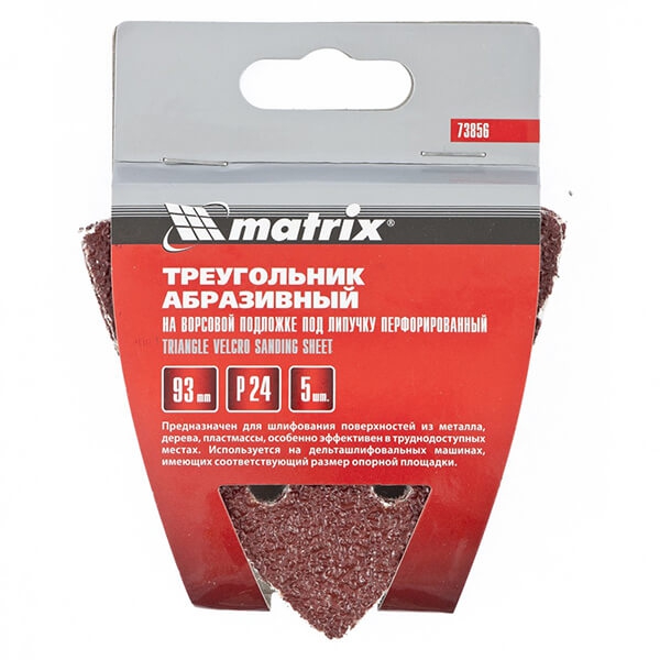 Треугольник абразивный под липучку, P 320, 93 мм, 5 шт Matrix 73867 предназначен для сухих шлифовально отделочных работах по металлу, дереву, пластмассе и другим материалам. Треугольник абразивный на ворсовой основе. Абразивная составляющая оксид алюминия. Треугольник может использоваться со шлифмашинкой соответствующего типоразмера.