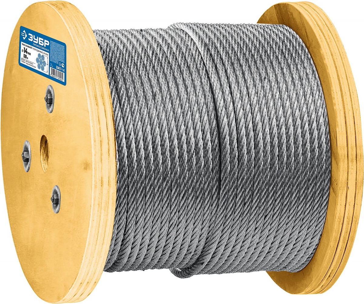 Трос грузоподъемный стальной, оцинкованный, DIN 3066, d=14 мм, L=50 м, ЗУБР Профессионал 30417-14