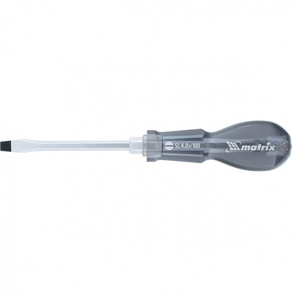 Ударная отвертка c усилителем под гаечный ключ SL5 x 75 мм Matrix 19100 имеет цельный стержень, проходящий сквозь всю отвертку, а также стальной затыльник, который позволяет наносить удары молотком или киянкой при демонтаже застарелых, прикипевших или заржавевших винтовых соединений. Стержень имеет в сечении шестигранную форму и в месте соединения с рукояткой оснащен шестигранной гайкой, позволяющей с помощью гаечного ключа прикладывать к отвертке дополнительное усилие при демонтаже трудно извлекаемых крепежных элементов. Наконечник стержня намагничен.