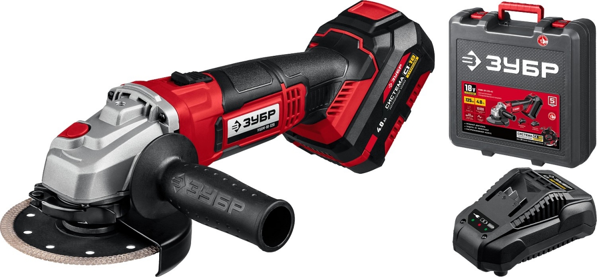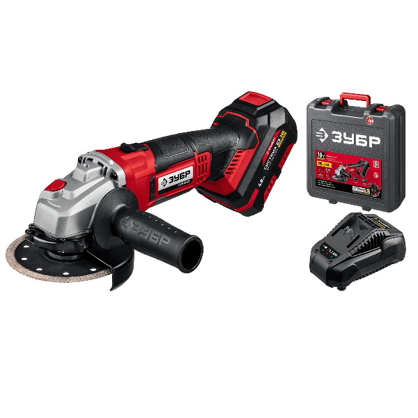 Угловая шлифовальная машинка 18В, 1 АКБ (4Ач), в кейсе ЗУБР УШМ-18-125-41 предназначена для шлифования и резки (продольной, поперечной, косой) металлических изделий различной формы, профилей, сварных швов.