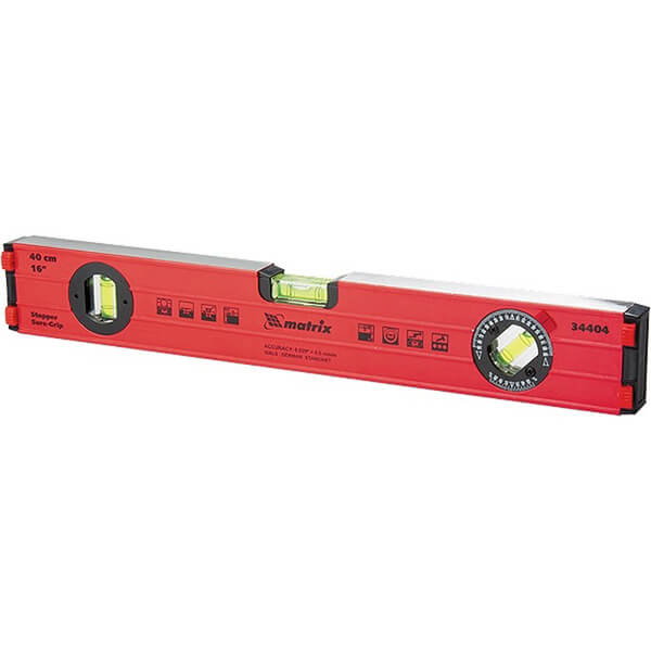 Уровень алюминиевый 1500 мм, 3 глазка Matrix 34415 позволяет определять отклонения поверхностей не только по горизонтали и вертикали, но и от любых других произвольно заданных углов.Усиленный профиль с двумя фрезерованными измерительными поверхностями и ребрами жесткости. Пластиковые заглушки на концах имеют резиновые вставки, предотвращающие скольжение при измерениях на наклонных плоскостях. Модель имеет три акриловых глазка для проверки отклонений по горизонтали, вертикали, а также регулируемый глазок для выверки произвольных углов. Точность измерений 0,5 мм/м (0,029 градуса).