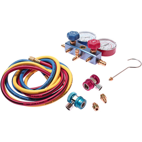 Основу оборудования составляет манометрический коллектор: блок из двух манометров (для измерения давления в каждом из контуров кондиционера) и штуцеров с вентилями. К штуцерам подключаются шланги для заправки хладагента или проверки давления, а вентили обеспечивают герметичность контуров и простую регулировку подачи хладагента. Манометры и вентили окрашены в синий и красный цвет: синий — подключается к стороне низкого давления (вентиль имеет надпись &Lo&, от английского &low& — &низкий&), красный — к стороне высокого давления (на вентиле надпись &Hi&, от английского &high& — &высокий&). На манометрах предусмотрено насколько шкал для измерения давления и температуры — по показаниям этих приборов производится диагностика системы, а также контролируется процесс заправки хладагента.