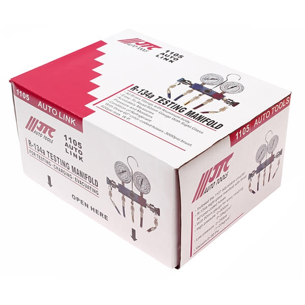 Устройство для заправки автокондиционера JTC JTC-1105 - специализированное приспособление для заправки автокондиционера. Заправляется хладагента R-134а. Манометрический коллектор оснащен смотровым стеклом и тремя цветными шлангами длиной 150 см. Содержит ответвитель JTC-1107. Высокое давление: 0-500 psi, 0-35 кг/см², низкое давление: 0-350 psi, 1-24,5 кг/см². Вакуум: 0-76 см ртутного столба.