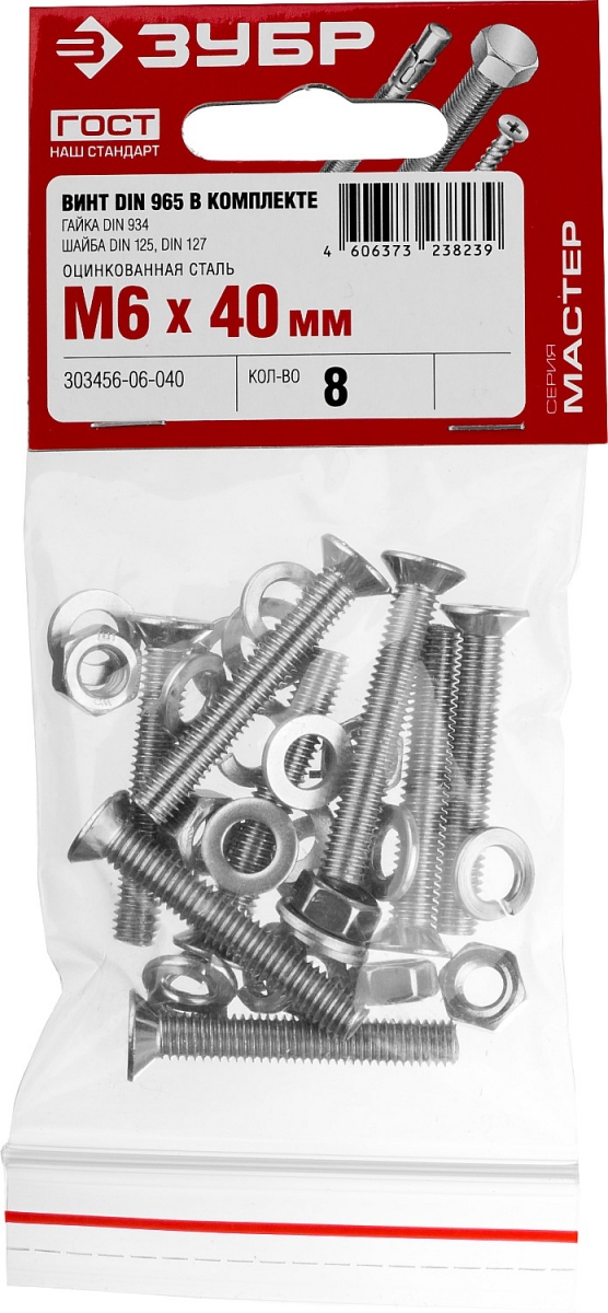 Винт (DIN965) в комплекте с гайкой (DIN934), шайбой (DIN125), шайбой пруж. (DIN127), M6 x 40 мм, 8 шт, ЗУБР 303456-06-040