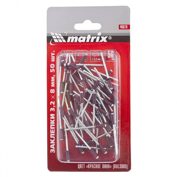 Заклепки 3,2 х 8 мм RAL 3005, красное вино, 50 шт Matrix 40678 предназначены для неразъемного соединения листовых материалов.