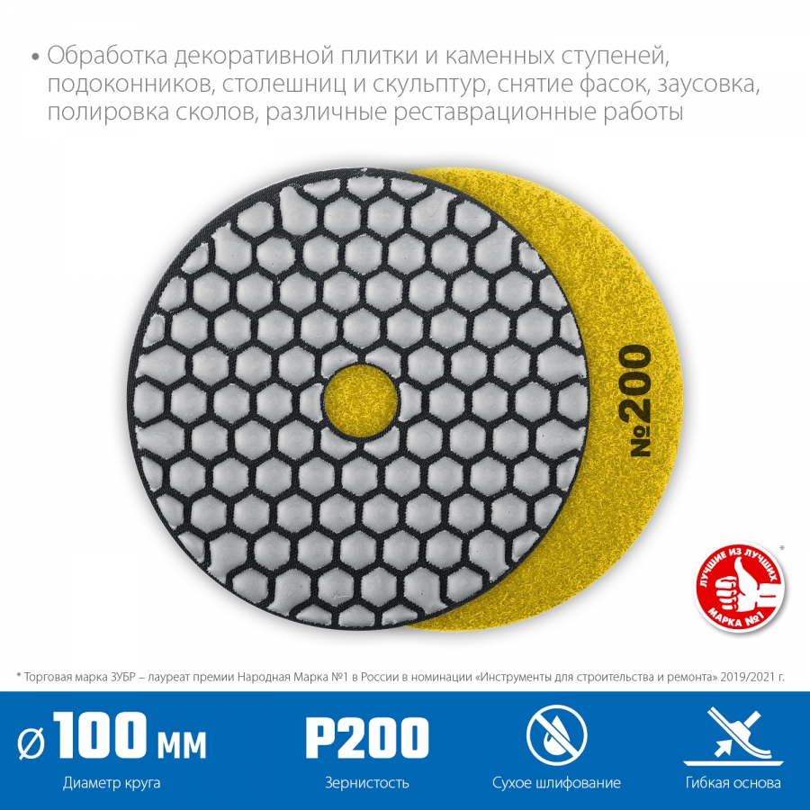 Для сухой шлифовки и полировки изделий из натурального и искуственного камня, керамогранита, гранита, мрамора. Используется на ручном электроинструменте (УШМ, полировальные машины, дрели) с насадкой адаптером под липучку Velcro. Охлаждение водой повышает ресурс инструмента.