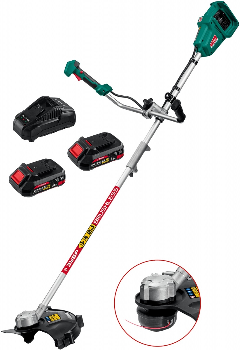 Универсальный инструмент на участке, способный заменить газонокосилку и триммер. Оснащается катушкой с леской (для мягкой растительности) и ножом (для грубой растительности). Большая мощность двигателя BRUSHLESS и две батареи позволяют косить довольно густую и грубую растительность длительное время