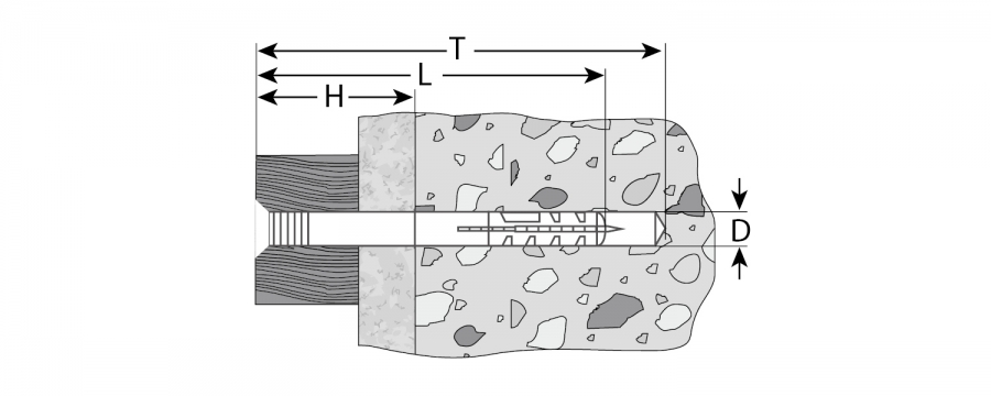 Для быстрого сквозного монтажа различных конструкций к полнотелым основаниям (бетон, кирпич, природный камень). Установка производится в предварительно просверленное и очищенное от буровой муки отверстие диаметром 8мм.