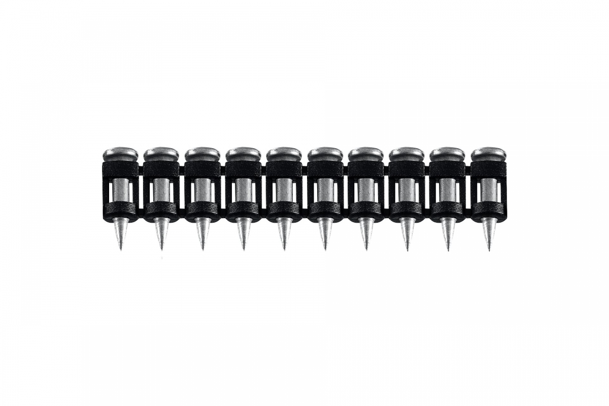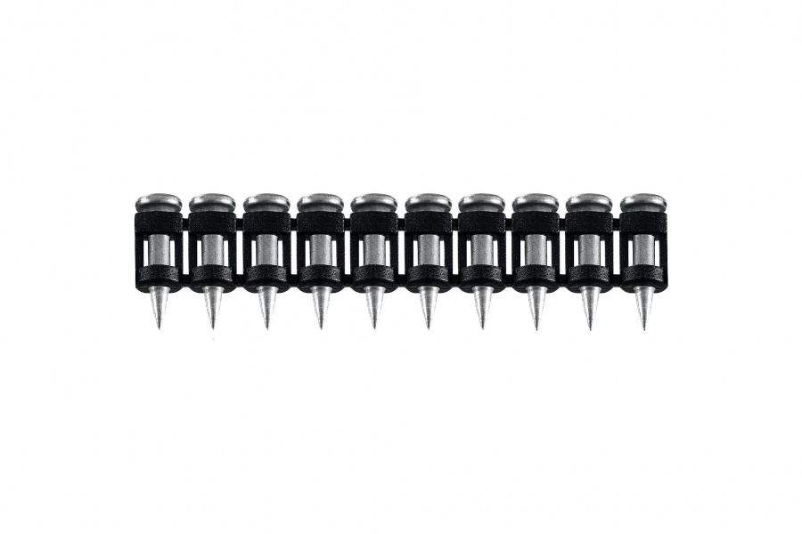 Усиленные гвозди по бетону соединены в кассету и забиваются при помощи газового или пневматического монтажного пистолета. Кованый наконечник пулевидной формы (Bullet Point) облегчает вхождение в высокопрочные материалы.