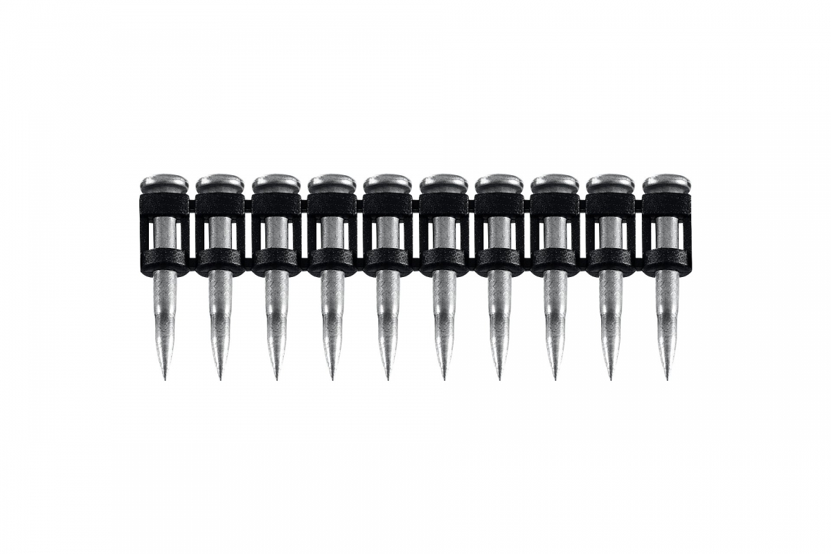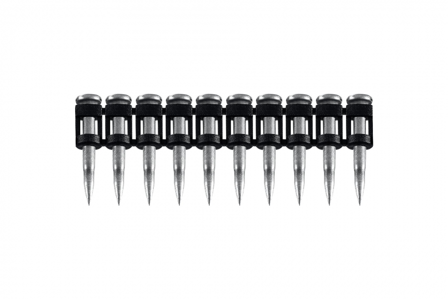 Усиленные гвозди по бетону соединены в кассету и забиваются при помощи газового или пневматического монтажного пистолета. Кованый наконечник пулевидной формы (Bullet Point) облегчает вхождение в высокопрочные материалы.