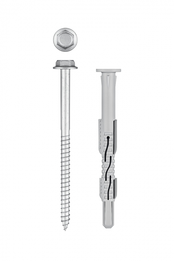 - Цилиндрический бортик дюбеля и шуруп с пресс-шайбой увеличивают площадь прижима фиксируемой детали, а также предотвращают проваливание дюбеля в отверстие.