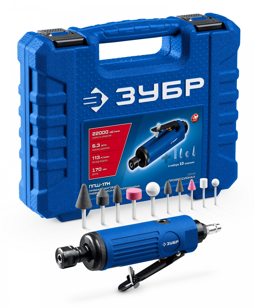 ЗУБР набор в кейсе: прямая цанговая пневмошлифмашина, 10 шарошек и оснастка, ПРОФЕССИОНАЛ (64333-H) 64333-H