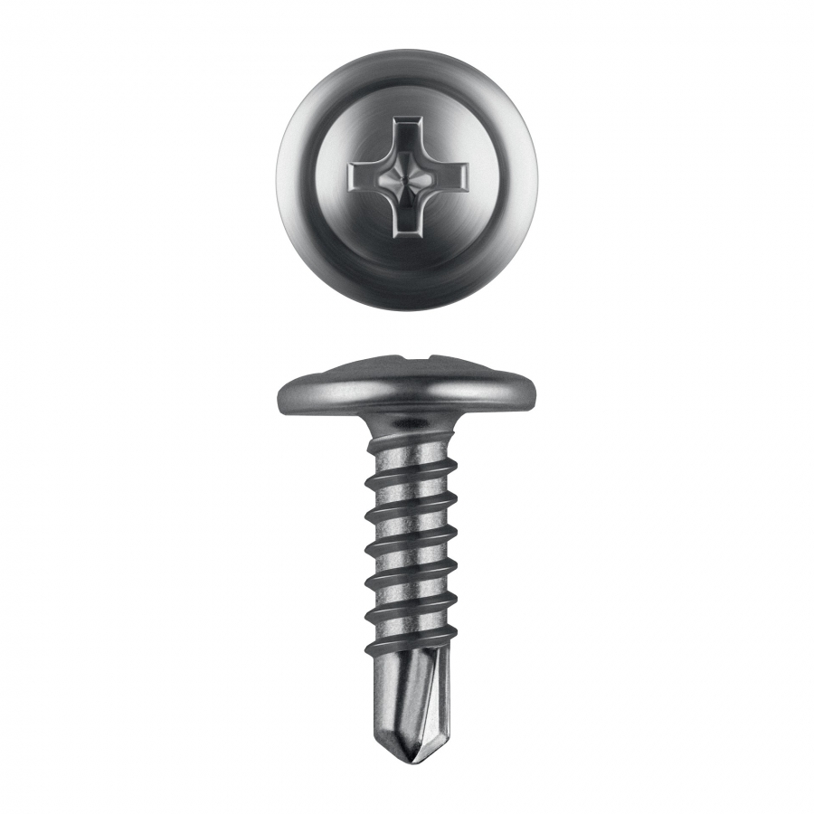 Саморезы с пресс-шайбой и сверлом для листового металла изготовлены из стального прутка с высоким содержанием углерода. Контроль за геометрией самореза начинается с калибровки прутка и заканчивается тщательной проверкой размеров готового изделия. Нормативная твердость стали достигается термической обработкой. Поверхностная твердость 560-720HV, твердость в сердцевине 240-425HV. Саморезы легко вкручиваются обычным шуруповертом или отверткой с крестообразным шлицем PH2 (DIN). Предварительное сверление в скрепляемых материалах не требуется. Геометрические размеры: диаметр пресс-шайбы (W) - 10.5-11.0мм, диаметр головки (Dk) - 6.5-7.0мм, диаметр резьбы (D) - 4.04-4.22мм, диаметр сверла (dp) - 3.1-3.2мм, длина сверла (ds) - 3.7-3.8мм, шаг резьбы (Pi) - 1.41мм.